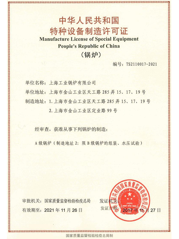 上海工业锅炉有限公司A级许可证